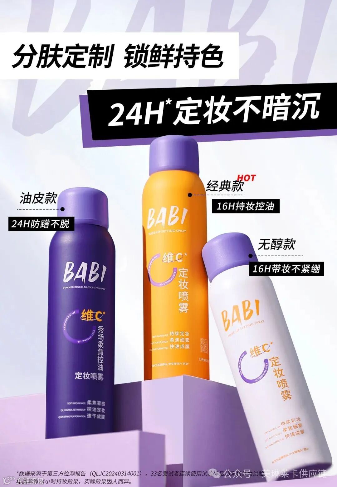 而BABI定妆喷雾则通过“VC入妆”等护肤理念和升级的DIM-LATOPN水粉配方,实现了锁鲜持色和保持肌肤水润感的效果,满足了消费者对于持妆不暗沉的诉求。