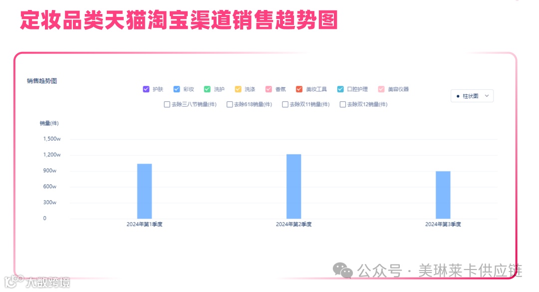 天猫淘宝的销售数据分析揭示了定妆品类需求的季节性高峰,尤其是在夏季。截至2024年前三季度,第二季度相较于第一季度的销售量增长了17.42%,这一显著增长反映了夏季对定妆产品的高需求。