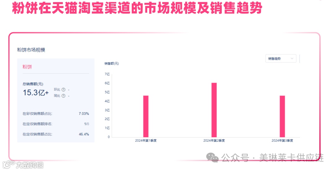 从天猫淘宝线上市场的整体规模来看,粉饼在定妆品类中占据了重要的地位,其总销量额达到15.3亿,销量占比为38.62%,销售额占比为46.4%。这表明粉饼在定妆品类中具有显著的市场影响力。