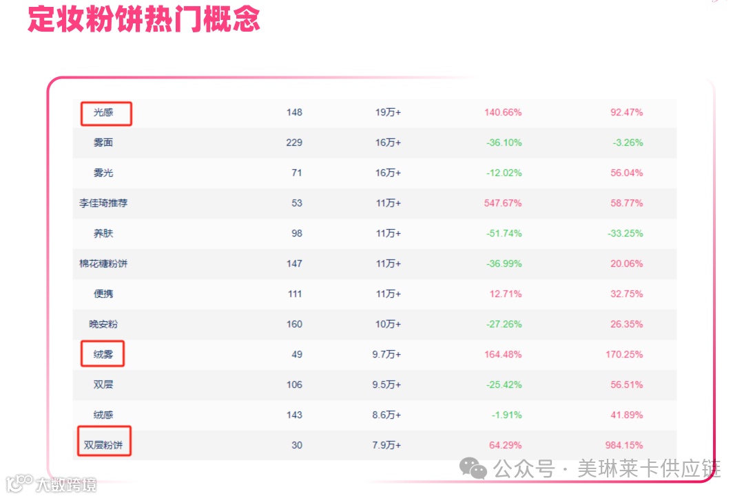 季节性特征对粉饼市场产生了显著影响。特别是在第二季度,防晒粉饼的销量与销售额呈现出环比上升的趋势,这很可能与夏季人们对防晒需求的增强紧密相关。与此同时,市场上“光感”、“绒雾”等妆效描述的产品日益增多,反映出消费者对能够塑造特定妆效产品的浓厚兴趣。