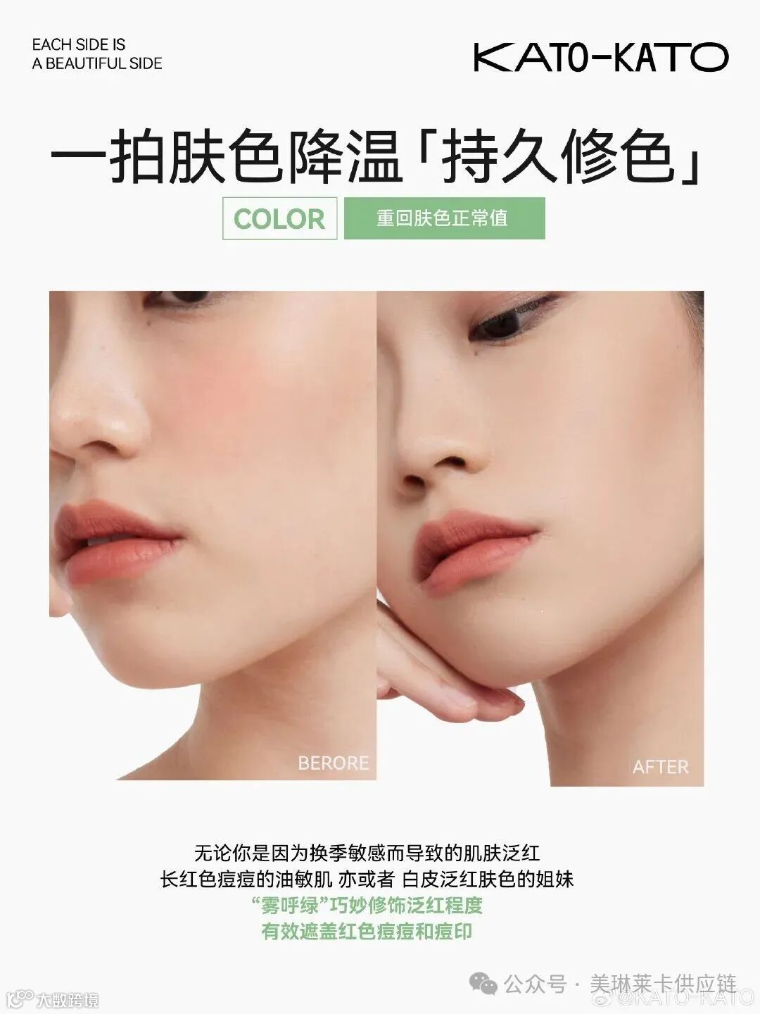 KATO-KATO的多云转雾控油散粉推出的「雾呼绿」款,宣称能够巧妙修饰肌肤泛红程度,并有效遮盖红色痘痘和痘印。这款产品采用全绿配方,通过28天的科学试验检测,证明其不致痘痘、不致过敏,上脸感觉轻柔如羽毛,非常适合油性和敏感性肌肤使用。