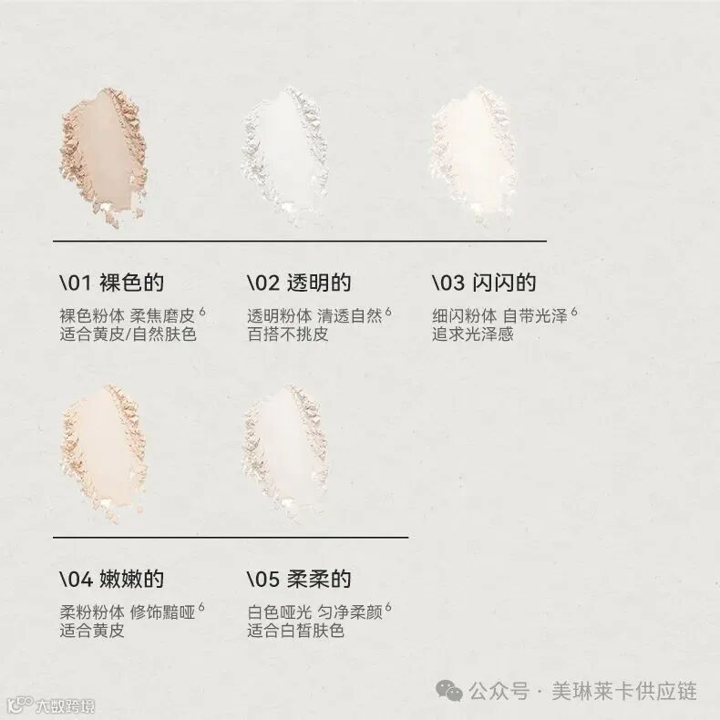 除此之外,市场上还涌现出了一系列值得关注的趋势和产品创新。裸色与透明色散粉的热销,不仅彰显了消费者对自然妆容的渴望,也映射出他们希望产品能与肤色完美融合的需求;同时,轻烟与空气感概念的盛行,更是凸显了消费者对轻薄定妆与舒适肌肤体验的追求。这些概念背后,透露出轻盈质地与透明妆效已成为年轻消费者的主流审美趋势。