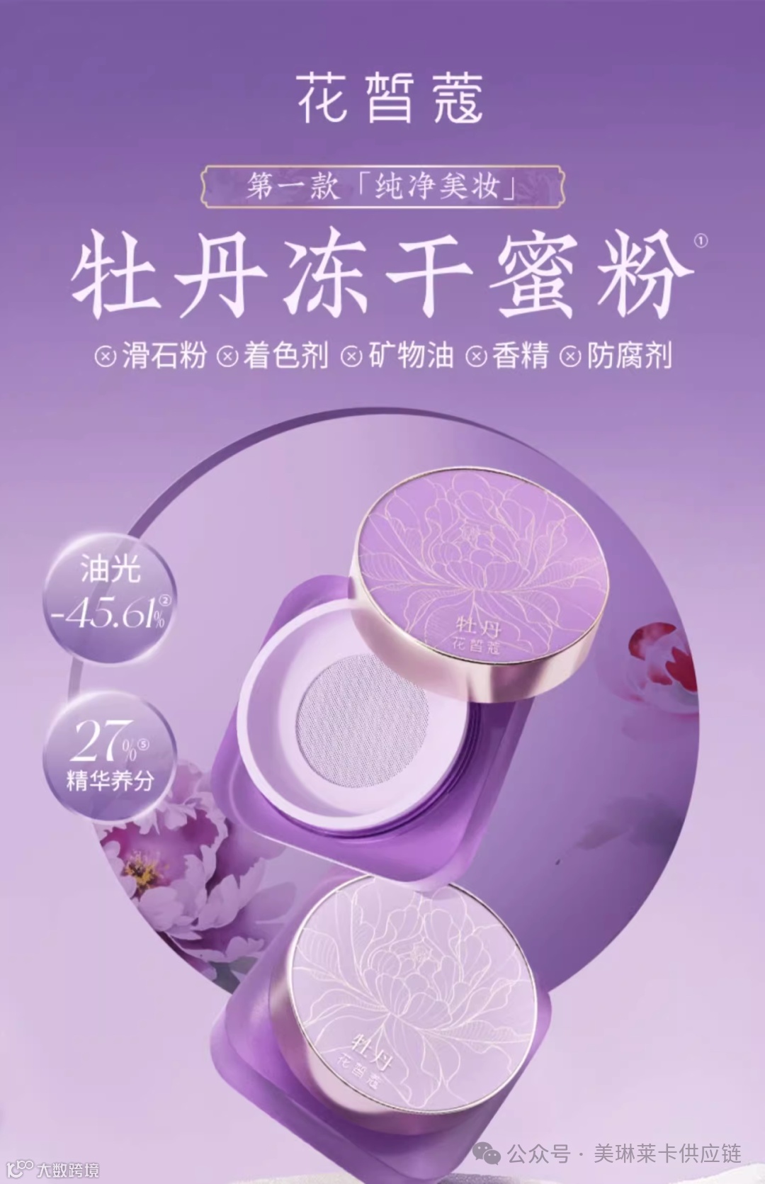 花皙蔻牡丹抗皱控油冻干蜜粉,专为油皮和油敏皮打造,创新开发冻干蜜粉技术,通过-40℃低温休眠脱水制粉,将27%护肤成分紧锁其中,推动彩妆行业妆养合一新风向。