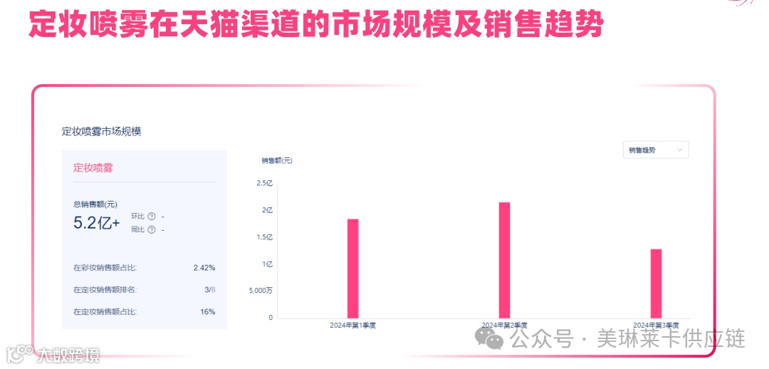 定妆喷雾类目截止2024年的前三季度,在天猫淘宝渠道的销售额达到了5.2亿以上,销量占定妆大盘的22.16%,销售额占定妆大盘的16%。