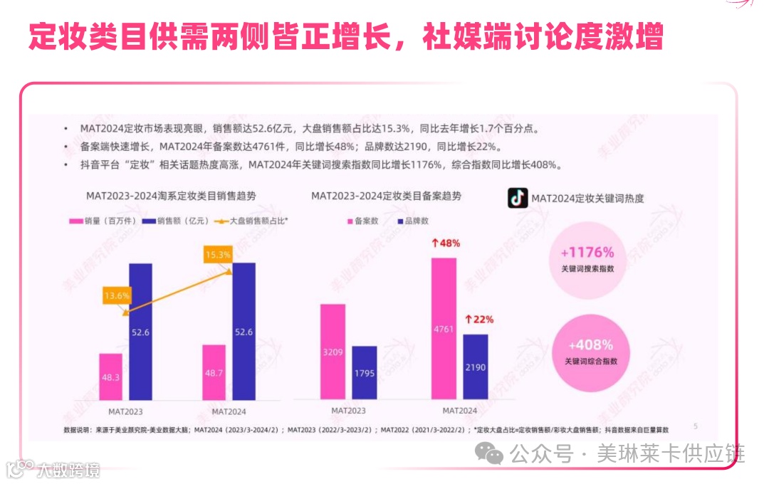 社交媒体内容营销在推动定妆品类升级与发展的过程中,发挥着举足轻重的作用。定妆产品凭借其卓越的遮瑕效果与便携性,在抖音等社交媒体平台上引发了广泛热议。据美业颜究院发布的《2024定妆品类趋势研究》报告显示,2024年MAT(月度活跃用户)关键词搜索指数同比激增1176%,综合指数也实现了408%的同比增长。此外,定妆产品的备案数量同样呈现出快速增长态势,2024年备案数高达4761件,同比增长48%,品牌数量也达到了2190个,同比增长22%。这一系列数据有力地证明了社交媒体在推动定妆品类蓬勃发展中的巨大作用与影响力。