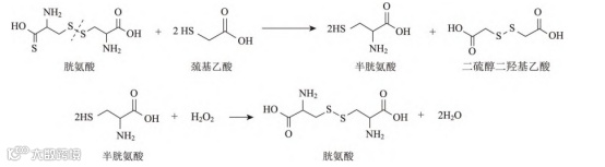 冷烫的烫发剂主要由碱剂、氧化剂与还原剂组成。在烫发时,为了使药水顺利进入皮质层需先用碱剂将头发的毛鳞片打开,然后使用还原剂如巯基乙酸 (HSCH2COOH)或巯基乙酸盐通过其强的还原作用打开头发多肽链之间的二硫键,形成半胱氨酸基团,从而软化发丝。将头发绕在圆筒形发卷上,再用弱氧化剂如过氧化氢 (H2O2),使二硫键在新的位置上重新形成,蛋白质链就按照发卷的形状排列起来,头发干燥后即形成所设计的形状