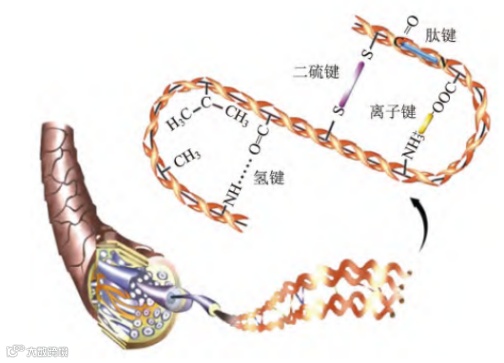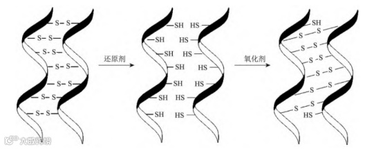 角蛋白的分子结构之所以紧密是因为在半胱氨酸的侧链上有一个化学性质很活泼的巯基(-SH),插在不同地方的2个半胱氨酸通过S—S的方式结合生成胱氨酸,相邻2个肽链中的巯基基团也会反应生成二硫键而相互交联。富含二硫键的交联结构使得头发有一定的形状和韧性,犹如一个巨大的分子弹簧,为烫发提供了结构基础。