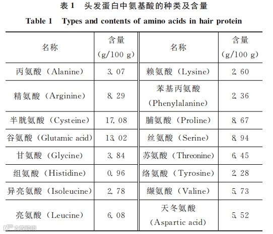使用高效液相色谱法等方法对酵解后的头发纤维进行氨基酸的种类和含量测试,发现头发蛋白中氨基酸种类丰富,其中半胱氨酸含量最高,约占17%,如表1所示。