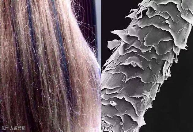 在染发过程中染发剂透过鳞片层的空隙进入角质层与蛋白质作用,使鳞片无法恢复精密状态,有轻微的剥蚀现象。