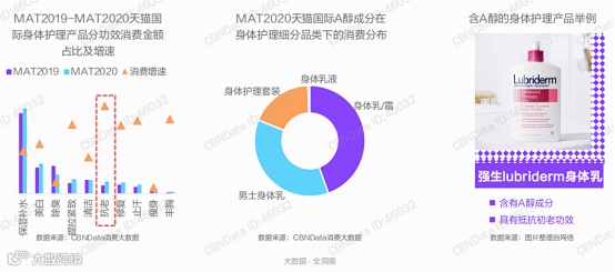 在天猫国际A醇成分身体护理细分品类下的消费分布中,男性身体乳分布占比成为仅次于普通身体乳霜存在,男性同样注重皮肤抗老