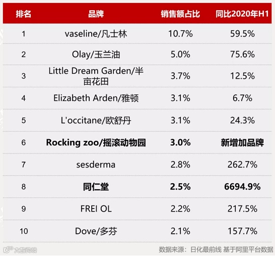 国产品牌表现亮眼:国货新锐品牌摇滚动物园以及国产知名品牌同仁堂借助KOL内容种草、直播带货、淘客推广等方式爆卖,在2021年上半年取得了超高增长,尤其是摇滚动物园。