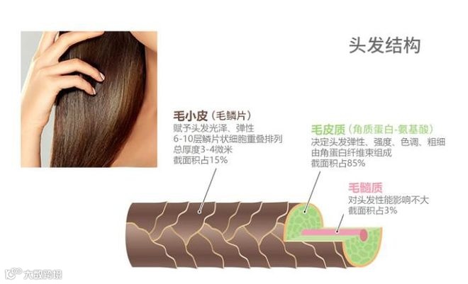 毛干中的蛋白质含量占65-95%左右,包括毛表皮、毛皮质和毛髓质。毛髄质一般认为对头发的强度贡献不大。毛表皮是鳞状片层结构,会产生不同方向的摩擦力,起到保护头发的作用。毛皮质是头发的主体部分,由纤维组成,起到赋予头发内在强度的作用。