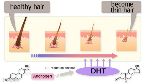 近些年来,大家比较倾向于认为雄性激素脱发。(androgenetic alopecia) 是常见的因素.雄激素会在前额头顶毛囊里的5a-还原酶的催化下生成二氢睾酮·DHT,这是损害毛赛的元凶,一旦形成就会不断攻击健康的毛囊,使毛囊萎缩、头发变细变软生长周期变短,直至毛襄坏死,头发再也长不出来。