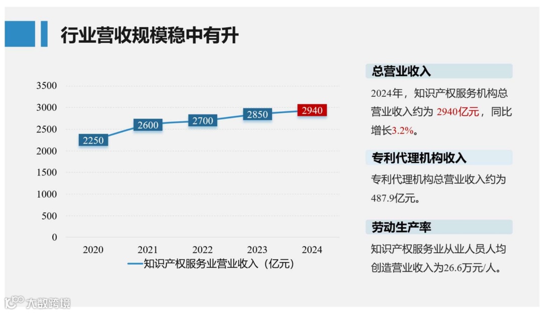 《2025年全国知识产权服务业统计调查报告》显示,2024年我国知识产权服务业总营收达2940亿元,同比增长3.2%。执行企业财务制度的机构平均营收289.4万元;