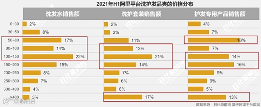 从销售额来看,2021年上半年阿里平台上洗护发产品高中低端各有分布,其中护发专用产品普遍客单价高于洗发水;