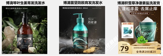 热销产品主要是Bodyaid博滴生姜洗护套装、 苗坚防脱育发洗护系列、博滴积雪草净澈姜盐洗发膏等。