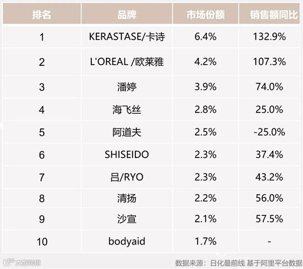 在TOP10榜单中,高端品牌卡诗以6.4%的市场份额占据榜首,且同比增速迅猛,TOP10品牌主要以国际品牌为主。