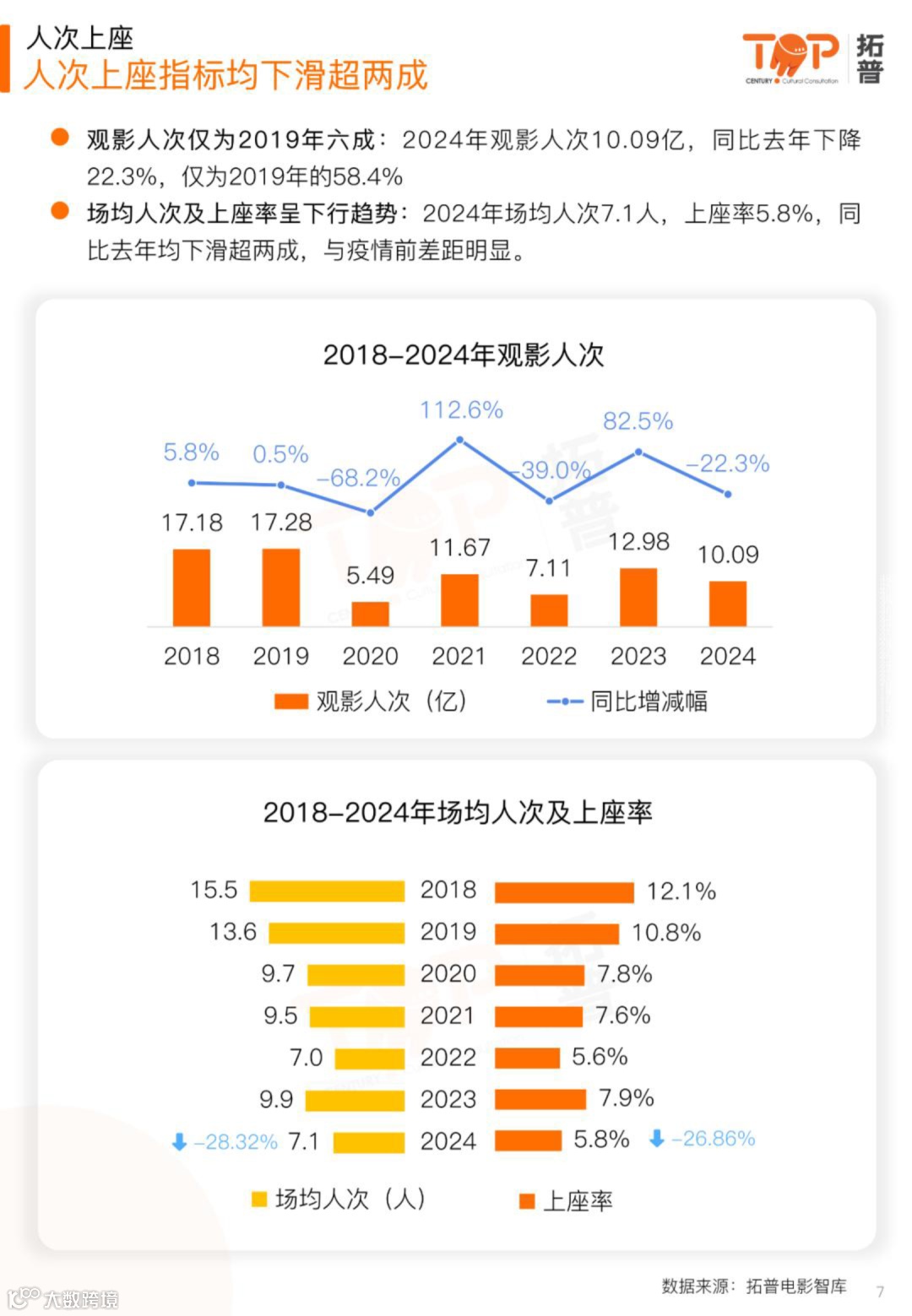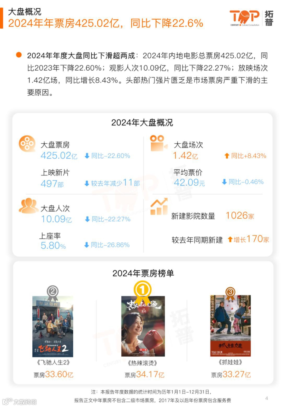 市场大盘下滑:2024年中国内地电影总票房425.02亿元,观影人次10.09亿,较2023年分别下降22.6%和22.3%,仅为2019年巅峰期的70%,凸显复苏乏力。