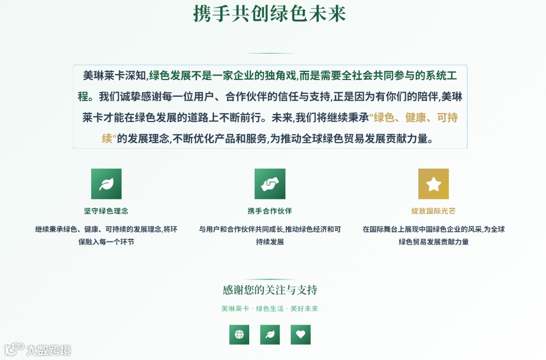 未来,美琳莱卡将继续秉承"绿色、健康、可持续"的发展理念,不断优化产品和服务,为推动全球绿色贸易发展贡献力量。我们相信,通过持续努力和创新,美琳莱卡必将在国际绿色贸易舞台上绽放更加耀眼的光芒!