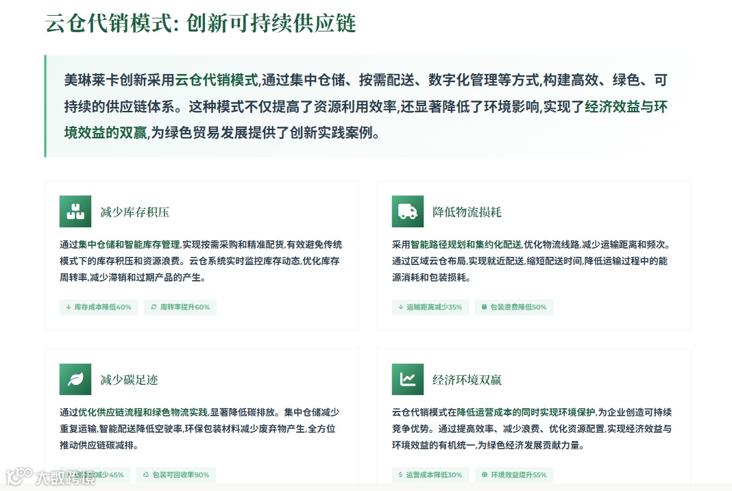 可持续发展模式:通过云仓代销模式,减少库存积压和物流损耗,降低碳足迹,推动绿色供应链发展。
