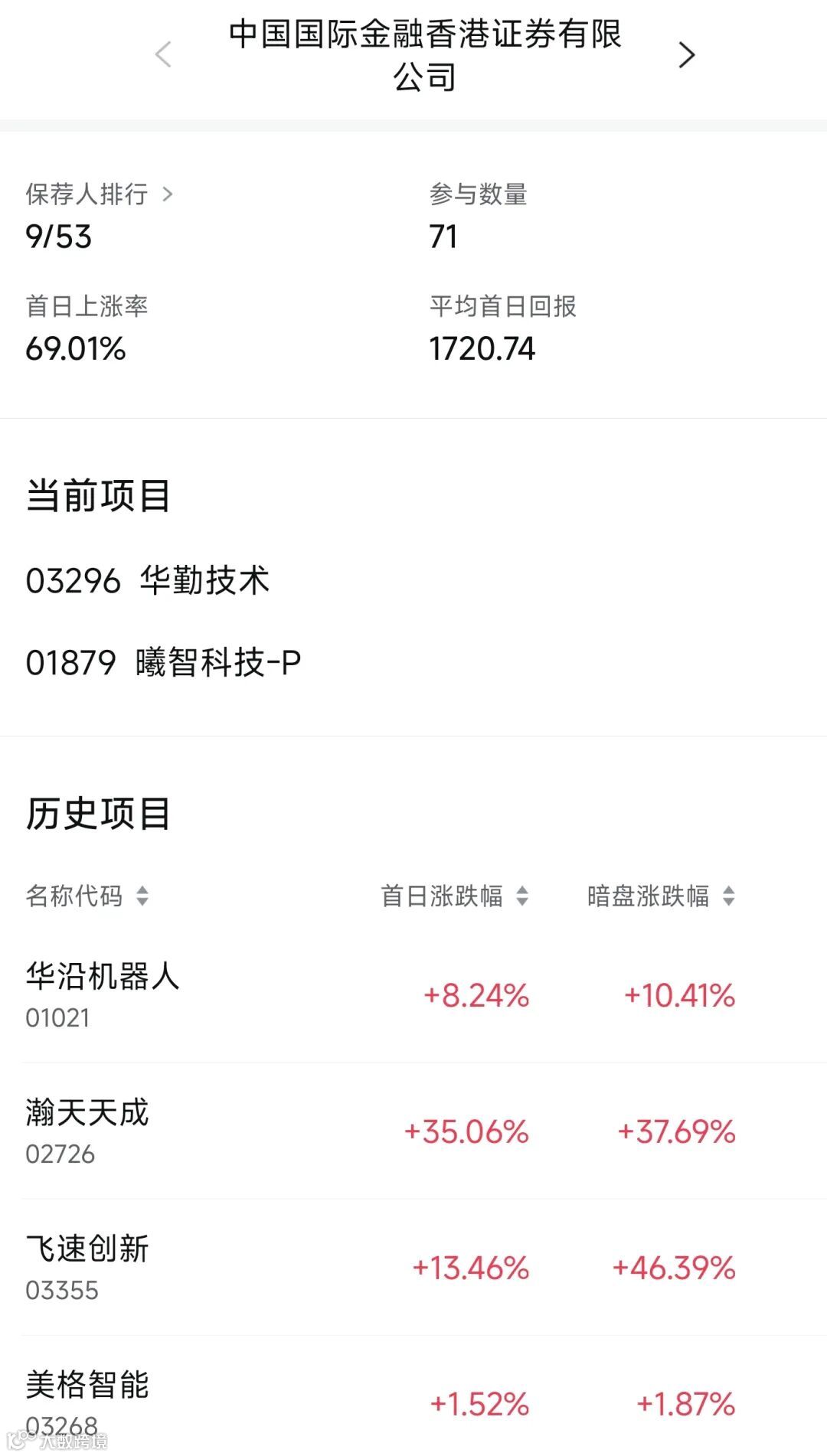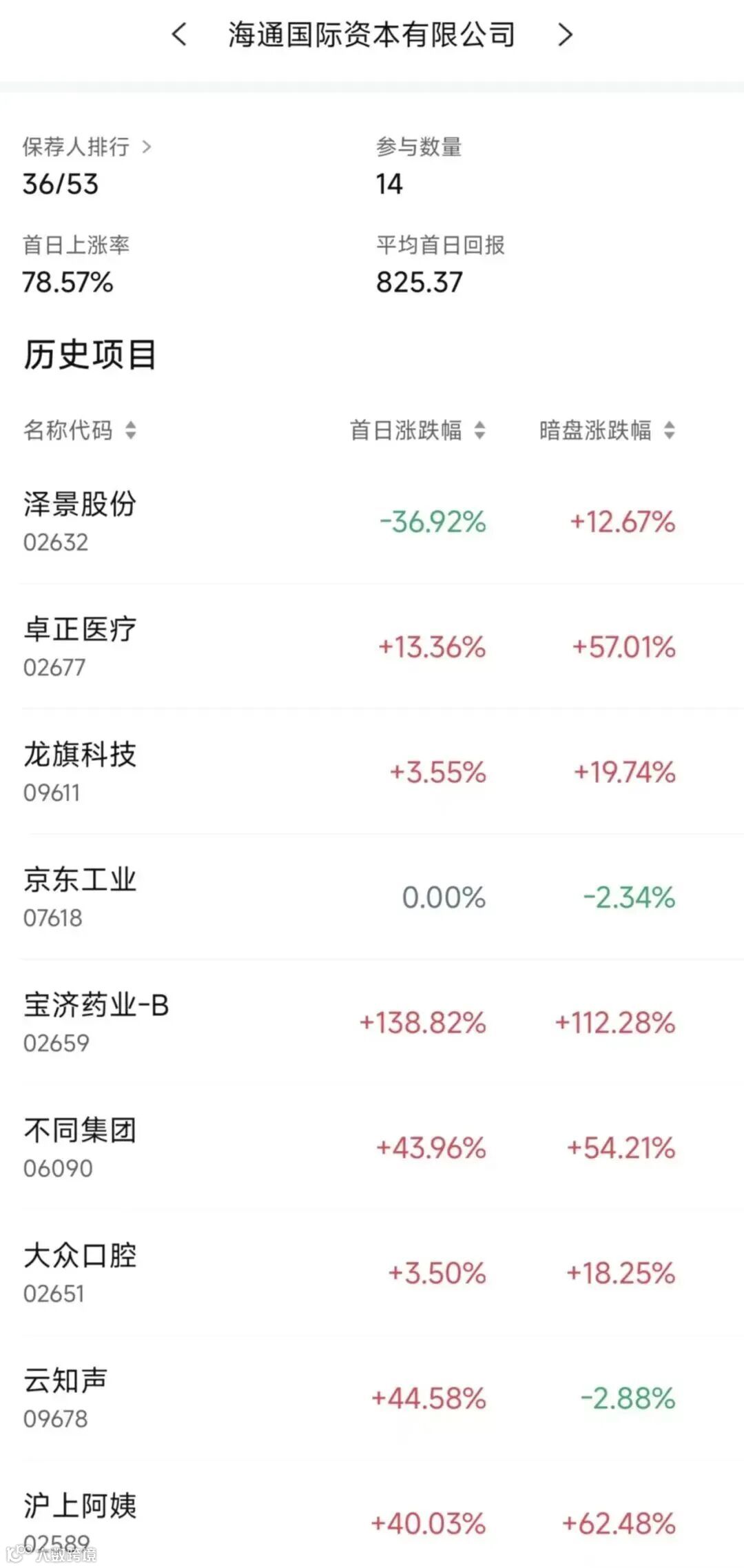 中金公司近2年港股保荐首日上涨率69.01%,平均回报1720.74港元;海通国际首日上涨率78.57%,平均回报825.37港元。
