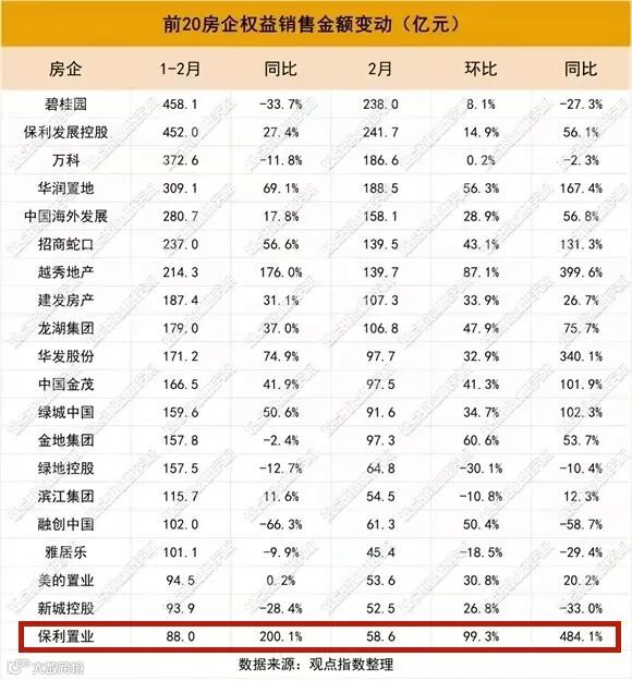 据“观点指数”榜单显示,前20房企权益销售金额变动表中,保利置业1-2月实现同比增长200.1%。2月单月环比增长99.3%,实现签约同比增长484.1%。1-2月,保利置业位居前20房企权益销售金额同比增长率榜首,为全年奋战开好头、起好步。