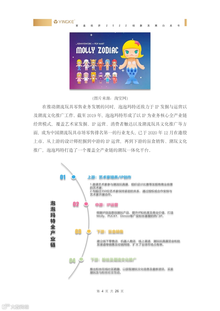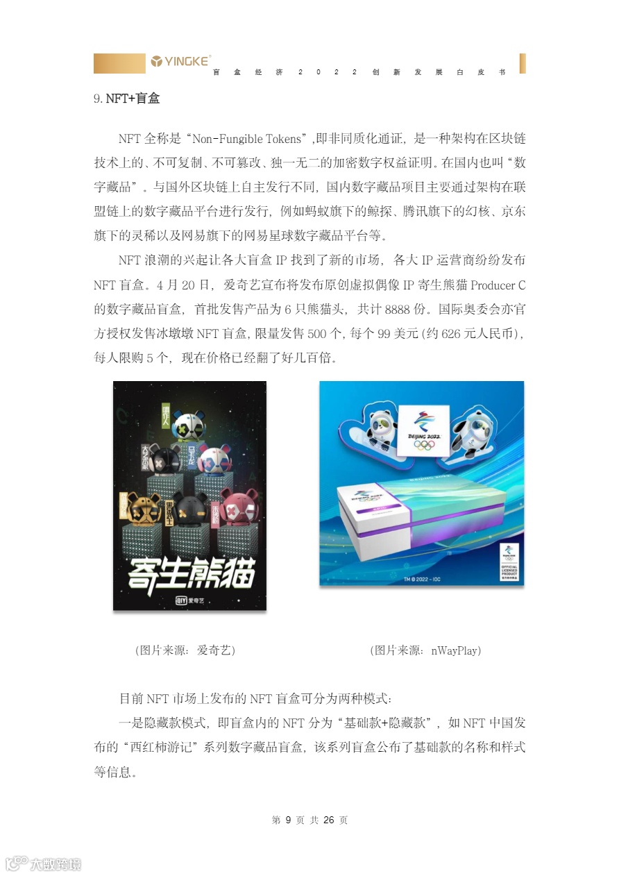 • “盲盒+X”跨界融合成新增长点:报告列举餐饮(肯德基Dimoo套餐)、文旅(同程旅行机票盲盒)、文博(河南博物院考古盲盒)、NFT(冰墩墩数字藏品盲盒)等九大创新场景,显示盲盒已从潮玩延伸至全品类营销,成为DTC品牌打造沉浸式消费体验的核心工具。