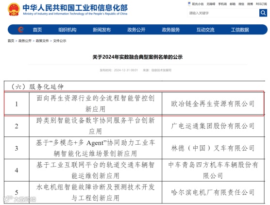 近日,在工业和信息化部举办的2024年实体经济与数字经济深度融合的典型案例征集活动中,欧冶链金凭借其面向再生资源行业的全流程智能管控创新应用项目,成功入选为工业互联网平台创新应用方向的典型案例。