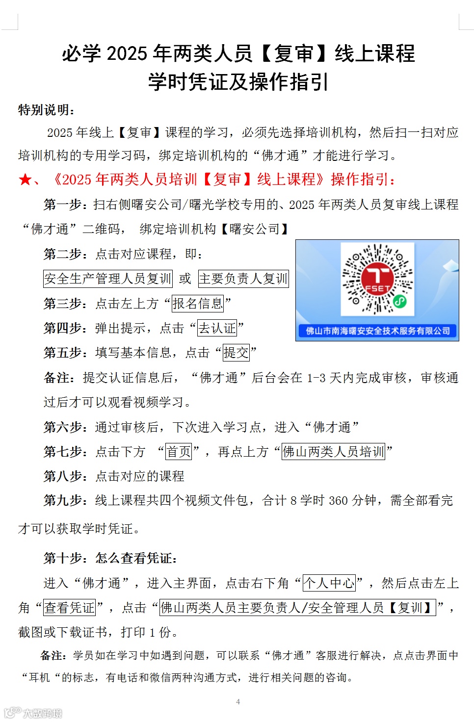 复审--【2025年两类人员培训-复训】,线上课程共四个视频文件包,合计8学时360分钟,全部看完才可以获取学时凭证。(后附图有学习指引,请提前绑定【曙安公司】后,后台审核通过,提前观看视频。)