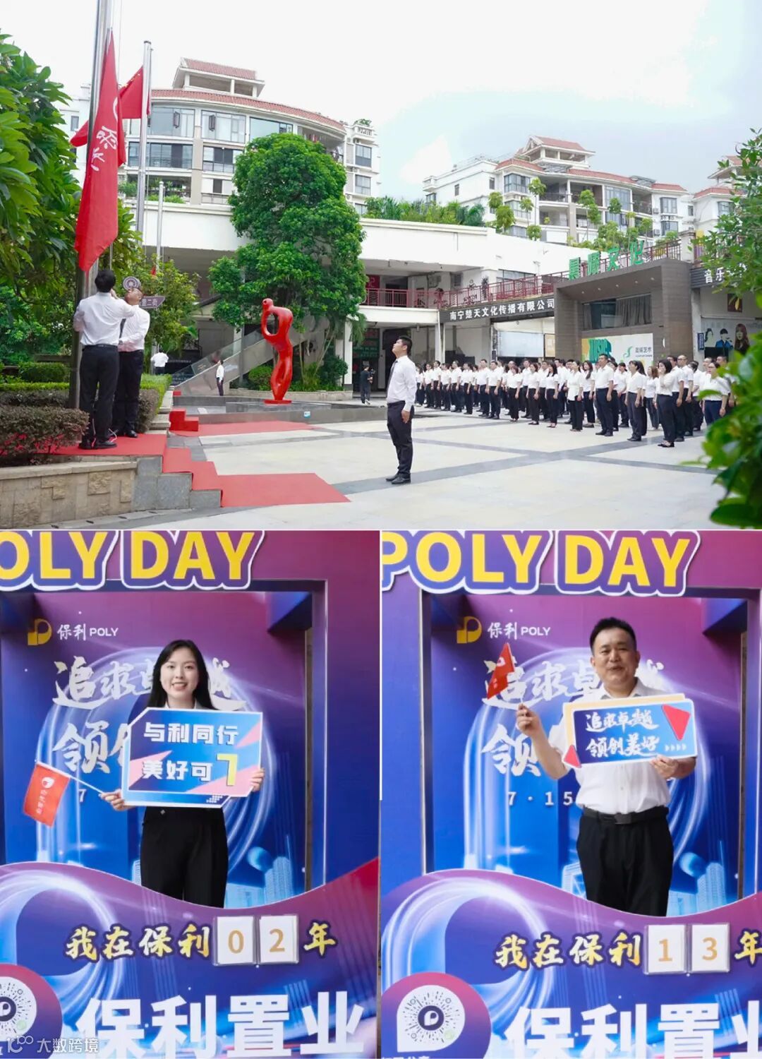 奋斗时代各有不同,保利青春一脉相承,一代代保利人展现出忠诚、担当、务实、奋斗的精神风貌。“7·15保利日”当天,保利置业及子公司举行了升国旗、唱国歌、升司旗、唱司歌的仪式。随着国旗、司旗随风飘扬,保利人共唱国歌和司歌,传承保利文化、弘扬保利精神,同频共祝“保国利民 追求卓越”的卓越口号。