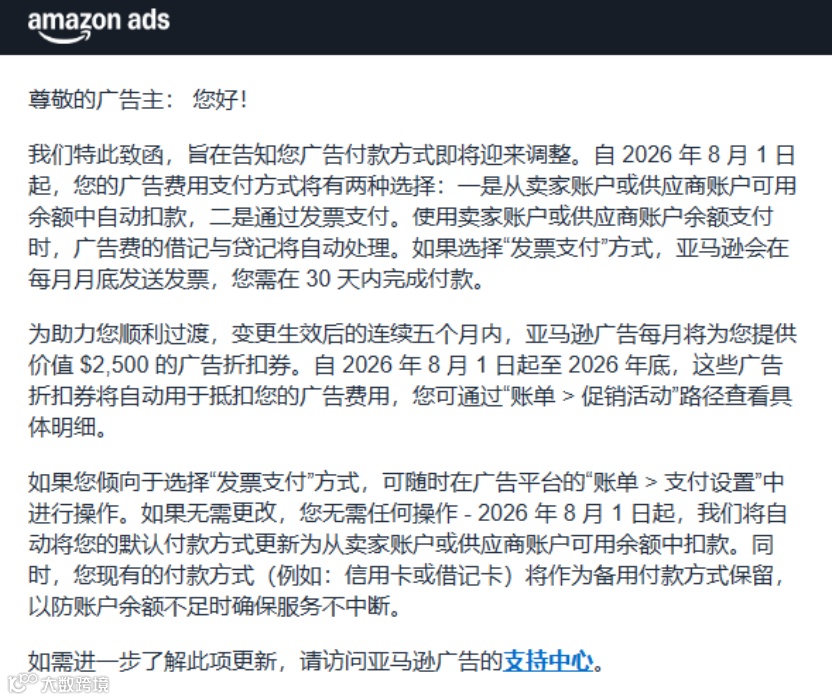 最近,不少卖家都收到了亚马逊广告发来的官方通知:自2026年8月1日起,亚马逊广告费用的支付方式将发生变化。