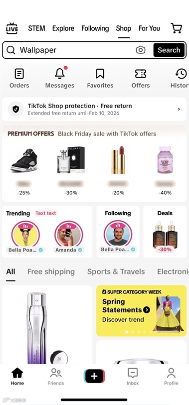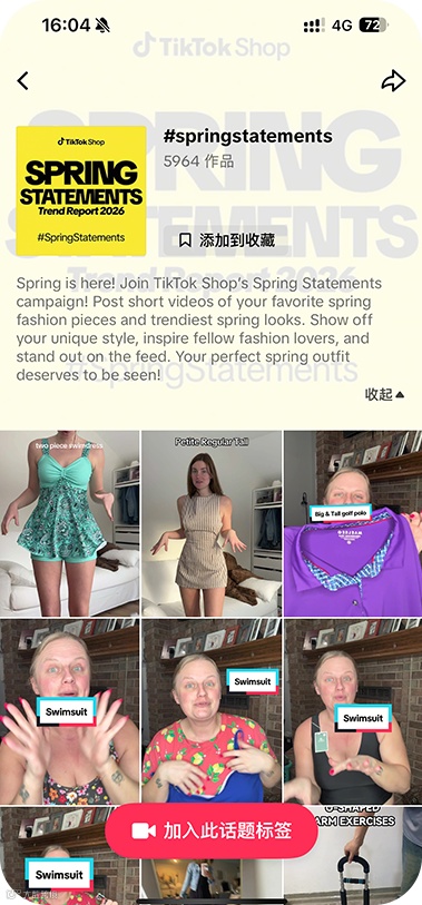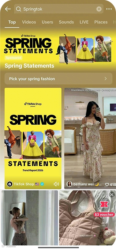 本次活动采用高饱和度亮黄色为主色调,凸显春日氛围感,不仅打造了主会场 H5 页面,还打通Branded Search Hub、话题页及商城 Feed Banner等流量入口,串联起内容种草到电商转化的完整路径。最终,#springstatements 主话题页收获超2.7 万条投稿,视频总观看量突破6000 万,近两周同比增长1082%;趋势主会场的平均停留时长超过 benchmark 5 倍以上。