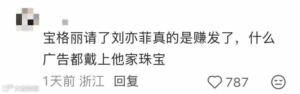 刘亦菲长期与LV、宝格丽等顶奢品牌深度合作,甚至在其他品牌代言中,宝格丽珠宝等奢品元素也会出现,这种刻在用户心智中的高端印象,能够转嫁到其所代言的其他品牌上。