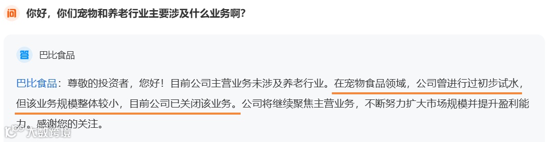 全球宠业出海洞察消息,日前,中国包子第一股巴比食品在投资者互动平台上表示,目前公司主营业务未涉及养老行业。在宠物食品领域,公司曾进行过初步试水,但该业务规模整体较小,目前公司已关闭该业务。公司将继续聚焦主营业务,不断努力扩大市场规模并提升盈利能力。
