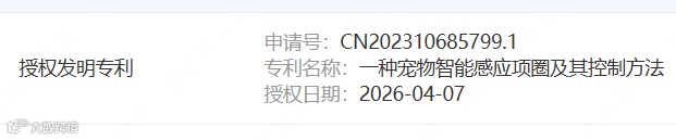 天眼查数据显示,汉桑科技获得发明专利授权,专利为“一种宠物智能感应项圈及其控制方法”,申请号CN202310685799.1。该专利可通过多单元检测宠物声音、定位、活动及生理信息,判断其行为与需求类型,并通过灯光单元展示。
