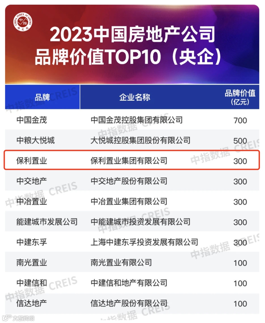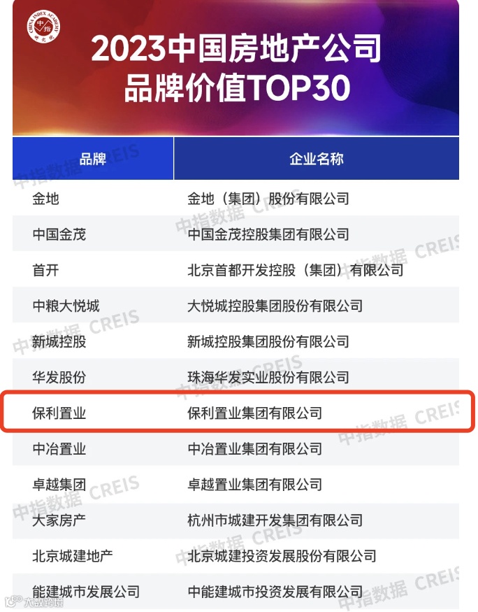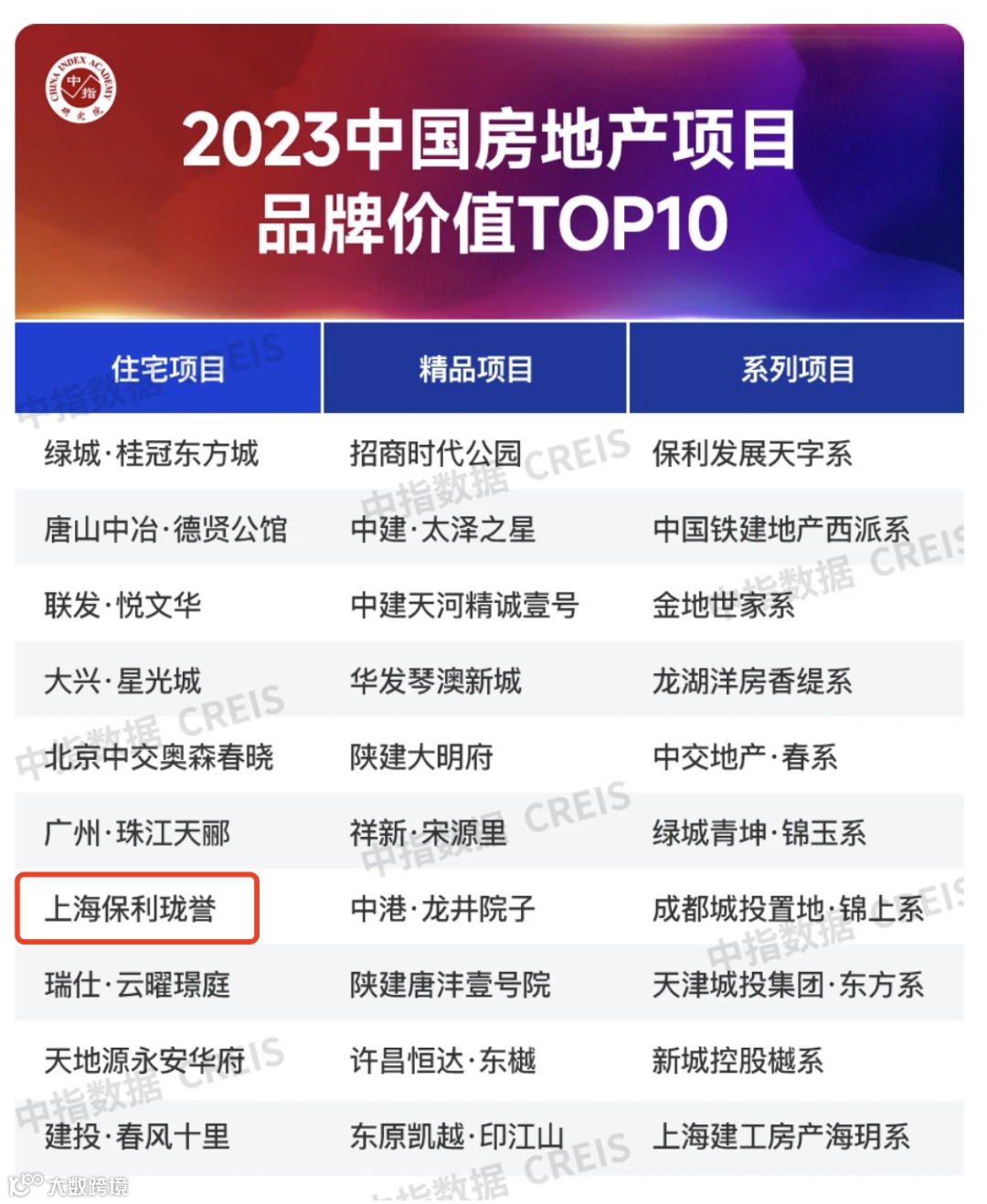 保利置业凭借稳中精进的开发及城市运营实力、稳中求进的高质量发展、卓越引领的产品服务力和美好向善的品牌影响力,荣获“2023中国房地产公司品牌价值TOP30”第7位、“2023中国房地产公司品牌价值TOP10(央企)”第3位、上海保利珑誉项目位列“2023中国房地产项目品牌价值(住宅项目)TOP10”榜单。