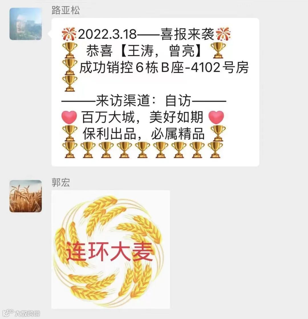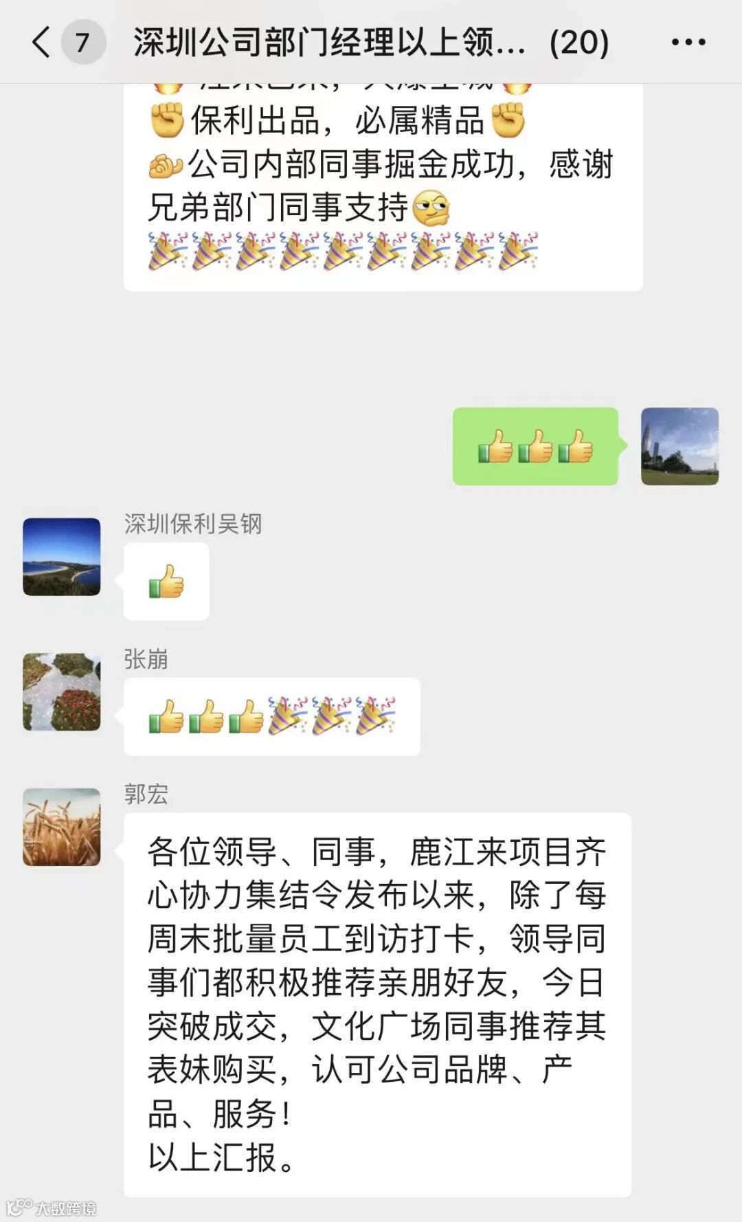 这时群里接二连三传来喜报。先是保利鹿江来项目经全员营销,由文化广场项目同事何悦转介成功销售一套;接着是保达誉都花园项目,在营销中心因疫情关闭的情况下,通过前期看房、线上沟通、线下签约的方式又成功销售一套。
