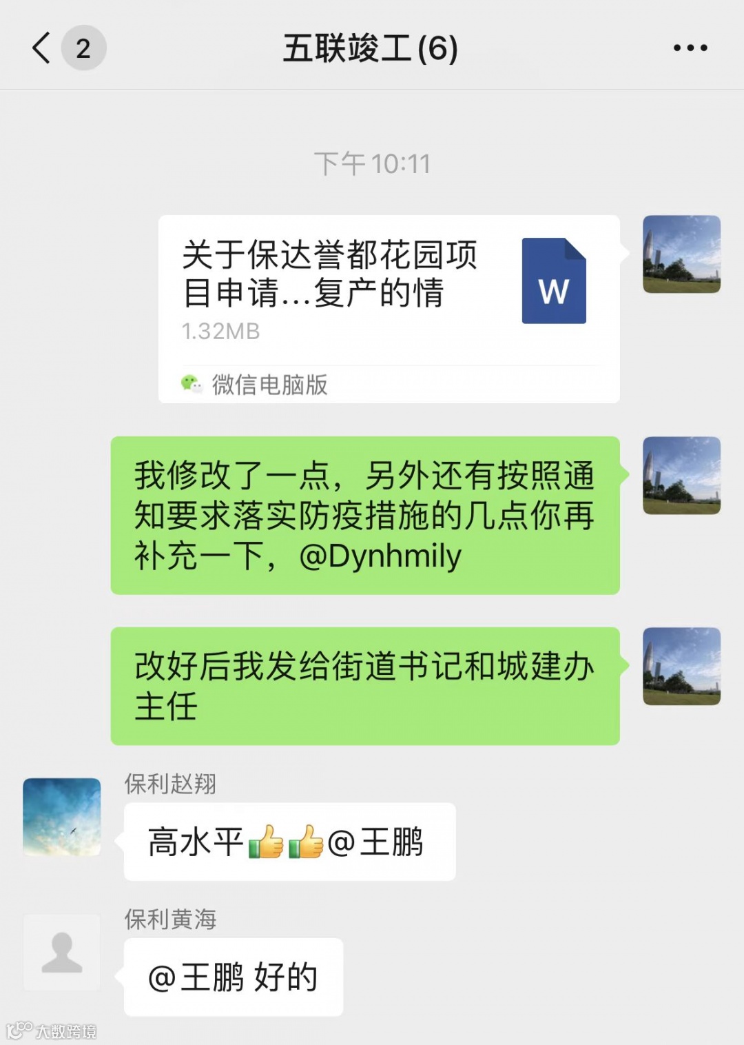 为尽快实现复工,工程部经理赵翔召集公司领导黄伟容、吴钢以及工程部、开发部有关人员沟通落实誉都花园项目的复工措施。会后,王鹏配合工程部向街道办、住建局报送了项目复工准备情况并提出了复工申请,争取早检查、早复工。