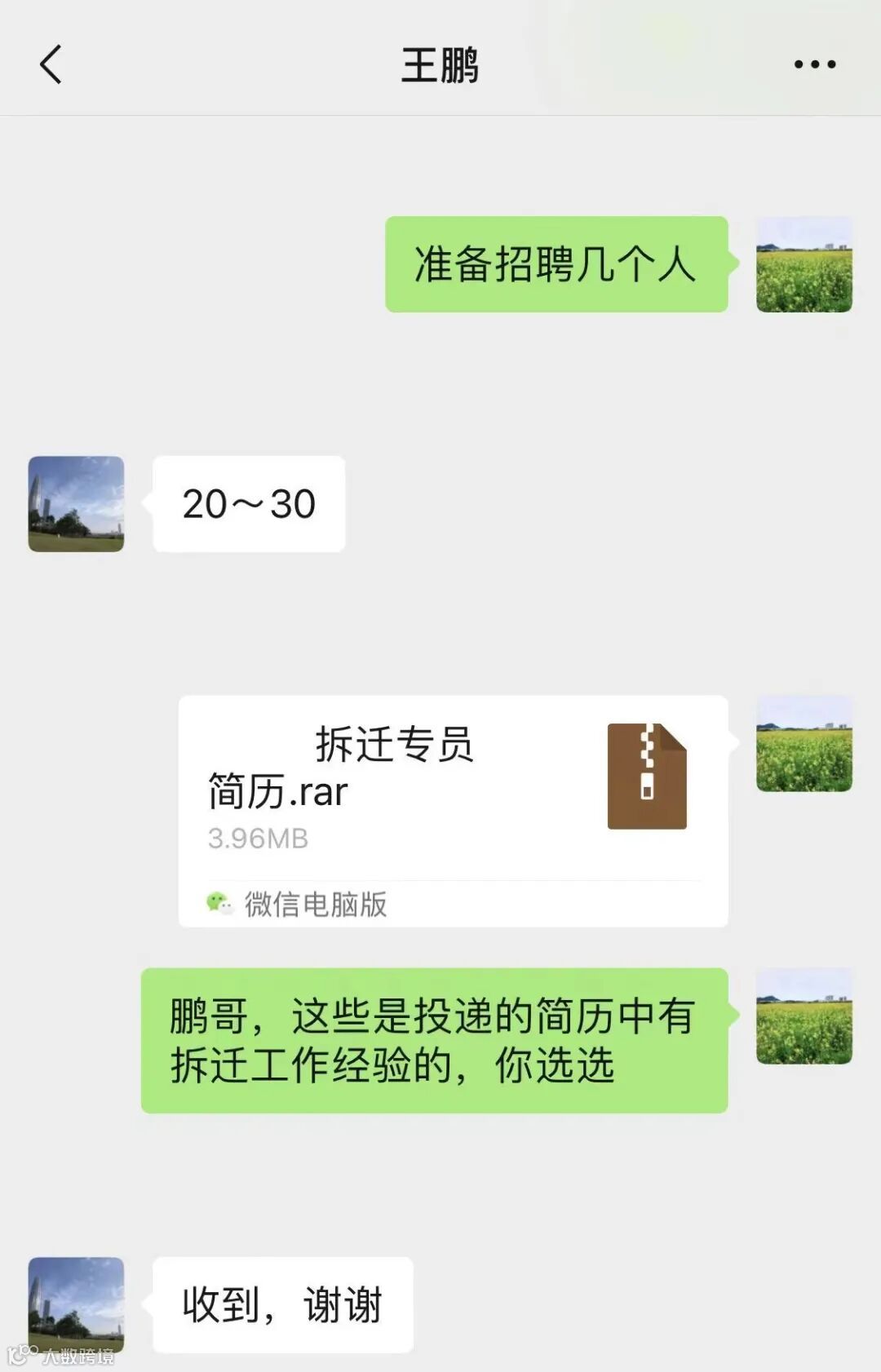 王鹏开始查看负责招聘的同事龚苗发来的简历。为适应新的拆迁形势,更好更快地推动项目拆迁工作,公司计划组建拆迁团队。龚苗看了上百份简历,为团队筛选出有经验、符合公司要求的拆迁人选,供王鹏进一步参考选择。