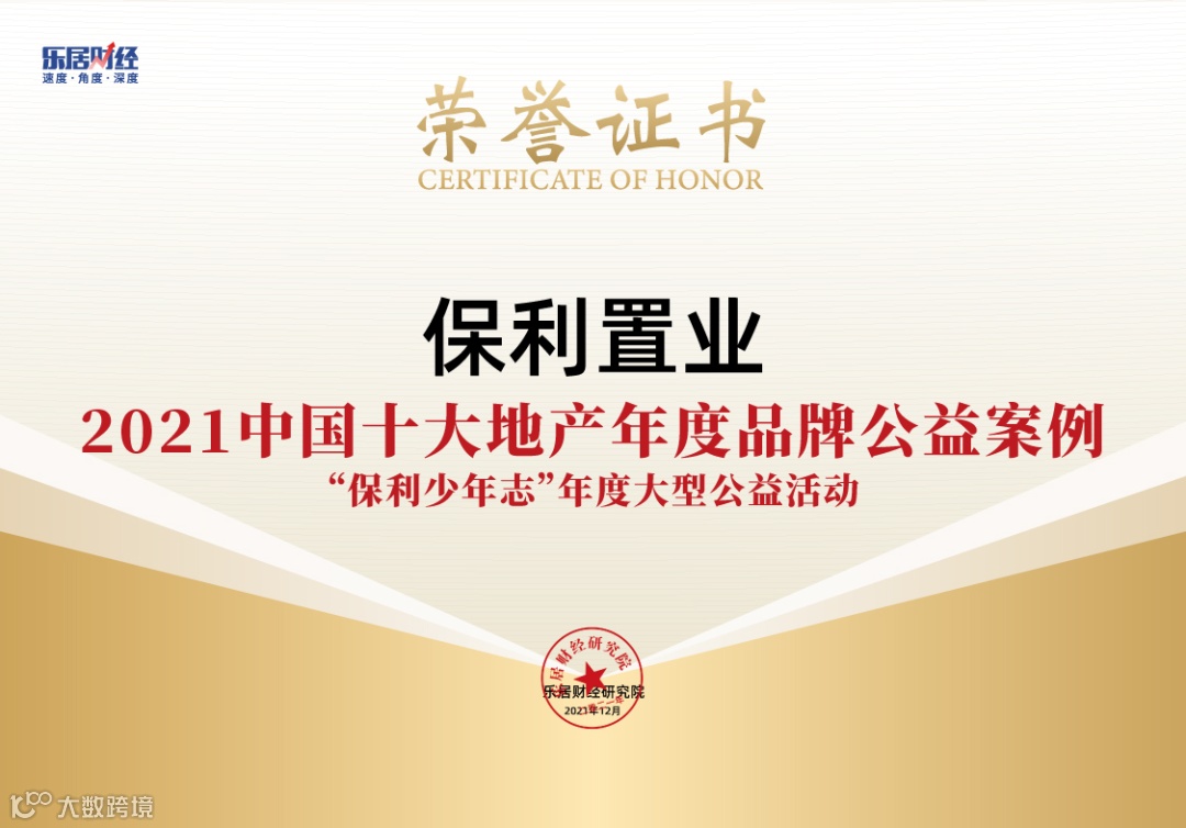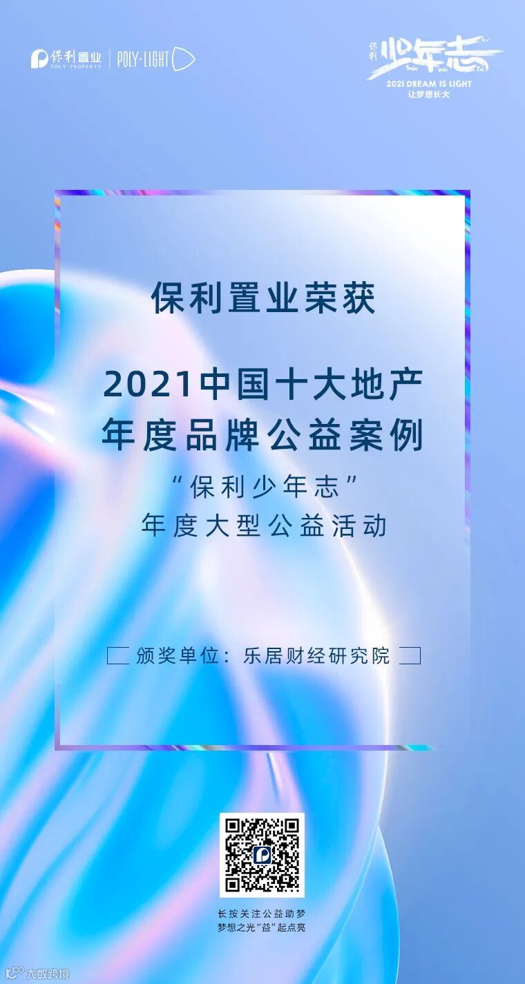 12月12日,由乐居财经主办,新浪财经、中国企业家、中房网、中物研协联合主办的2021(第五届)中国地产新时代盛典在北京举行。保利置业凭借“保利少年志”年度大型公益活动,荣获“2021中国十大地产年度品牌公益案例”,彰显着社会对保利置业在公益领域所践行的社会责任给予高度的认可及肯定。