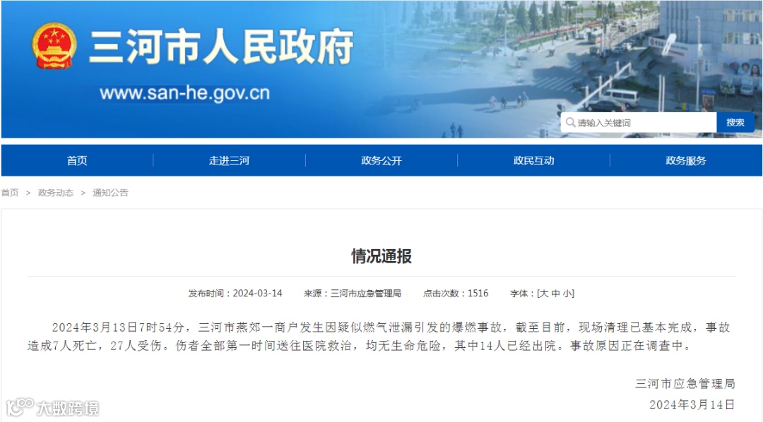 河北省三河市应急管理局3月14日凌晨1时许发布情况通报称,13日7时54分,燕郊镇一商户发生因疑似燃气泄漏引发的爆燃事故,事故造成7人死亡、27人受伤。截至目前,现场清理已基本完成,伤者全部送往医院救治,其中14人已经出院。事故原因正在调查中。