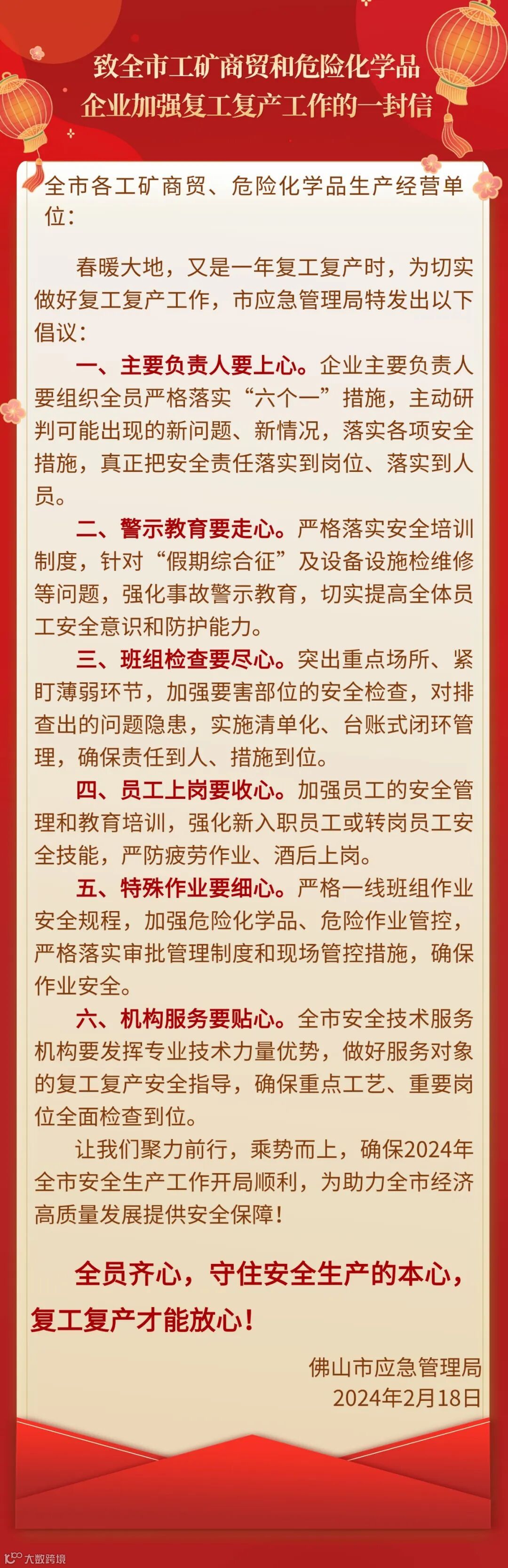 佛山市应急管理局发出一封信:强化“六心” 全力抓好节后复工复产!