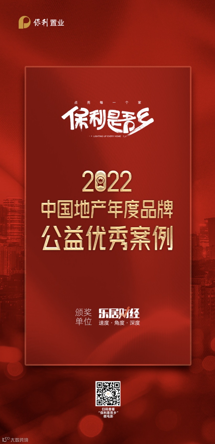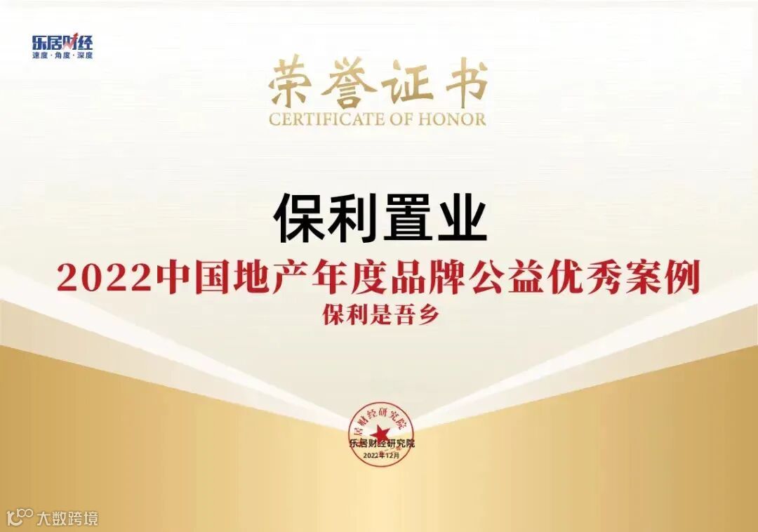 追求卓越,领创美好。2022年,保利置业紧扣时代脉络,在机遇和挑战中促发展。践行“责任为本,发展至上”的核心价值观,全力以赴做好品牌文化的“讲述者”“传承者”“示范者”和“践行者”,为打响央企保利品牌贡献卓越力量。12月28日,由乐居财经主办,中国房地产业协会、全国工商联家具装饰业商会共同指导,新浪财经、中国企业家、中房网联合主办的2022(第六届)中国地产新时代盛典盛大举行。保利置业凭借“保利是吾乡”年度服务品牌IP,荣获“2022中国地产年度品牌公益优秀案例”,彰显着社会对保利置业积极践行央企社会责任、推动国家乡村振兴战略实施的高度认可。