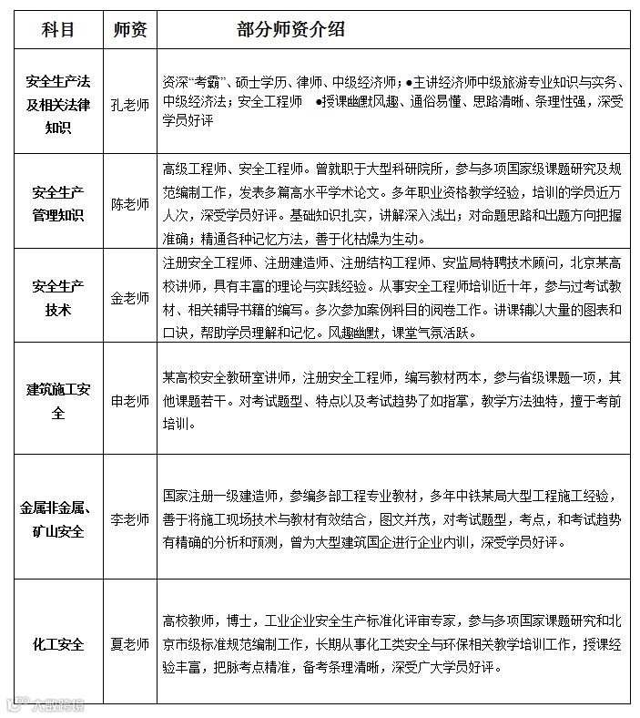 2023年注册安全工程师考前培训辅导班部分师资,均为历年有着丰富培训辅导经验的资深老师组成: