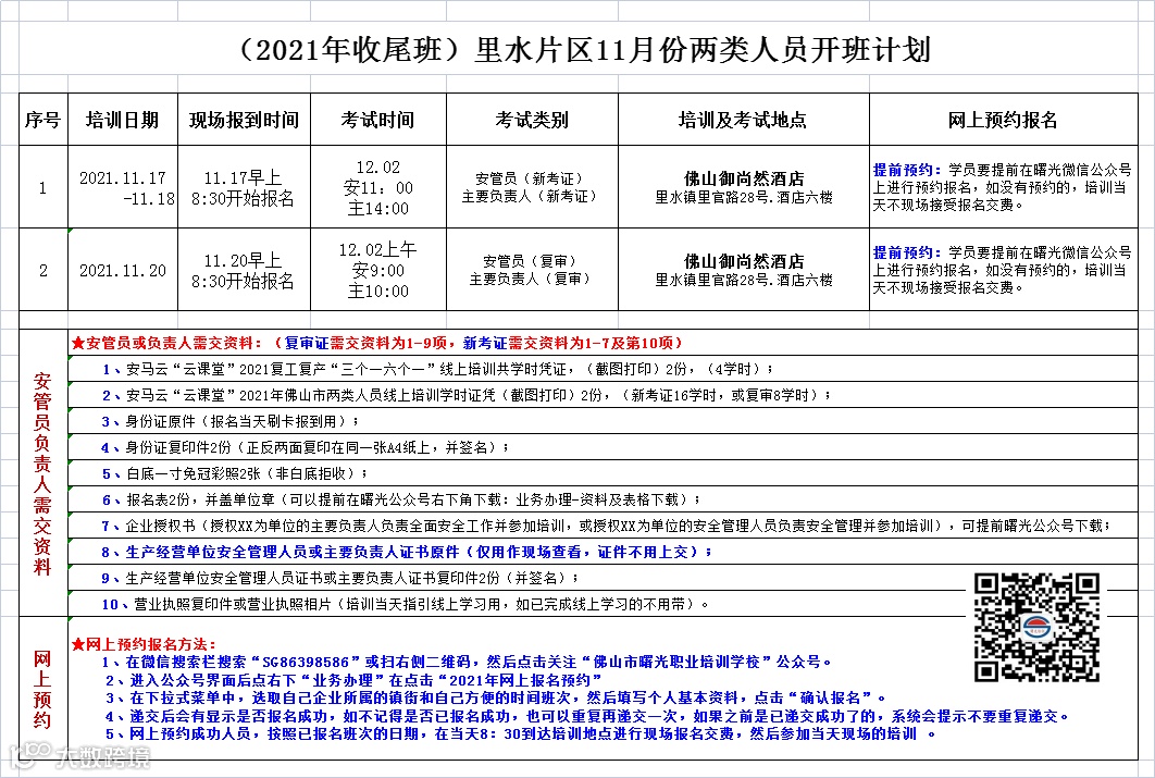 里水片区11月份收尾班的安管员、主要负责人开班如下表,开班地点为:佛山御尚然酒店(里水镇里官路28号,六楼会议室),请有需要的企业提前在曙光学校公众号上预约,然后在开班当天早上9点前去到现场报名交费培训。