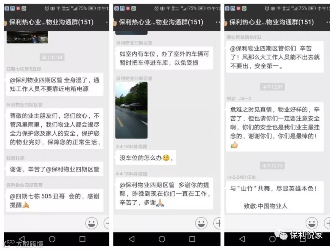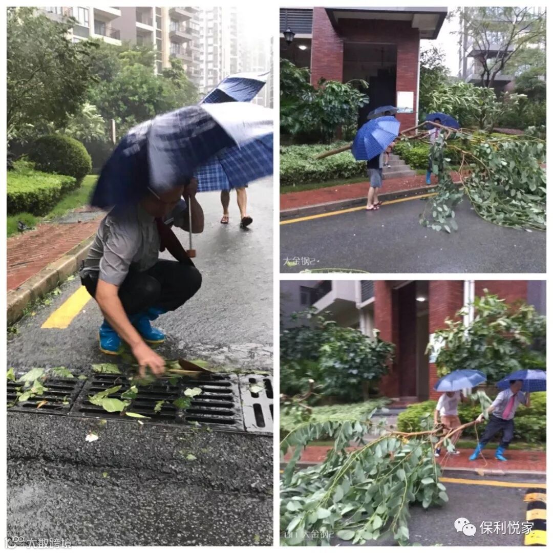 保利佳物业各服务中心在风前、风中、风后都严守岗位,时刻防范台风带来的灾害,及时发布相关信息,让业主放心,收到暖心的赞扬。