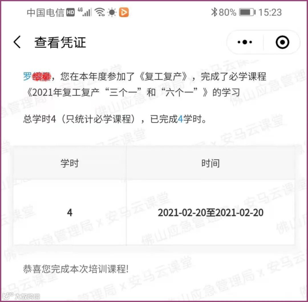 复工复产学习指引:进入佛山应急管理公众号,点右下角查找服务,点线上培训,点最上部分的2021年复工复产线上培训,然后准确输入个人的学习信息,点2021年复产培训“三个一”,学完后就可以获得凭证了,如下: