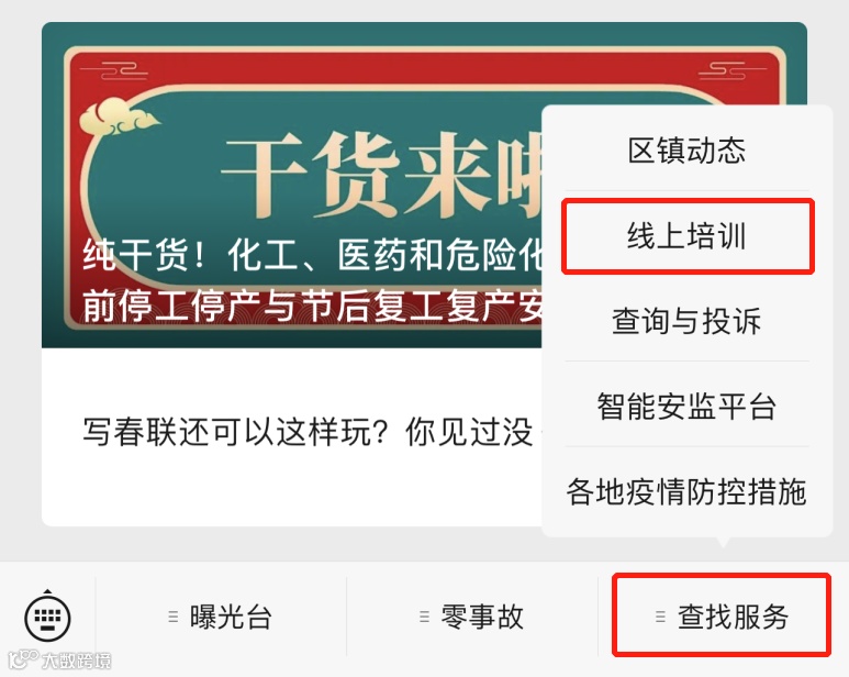 点“佛山应急管理”微信公众号菜单栏【查找服务】,然后再点击【线上培训】,进入小程序。