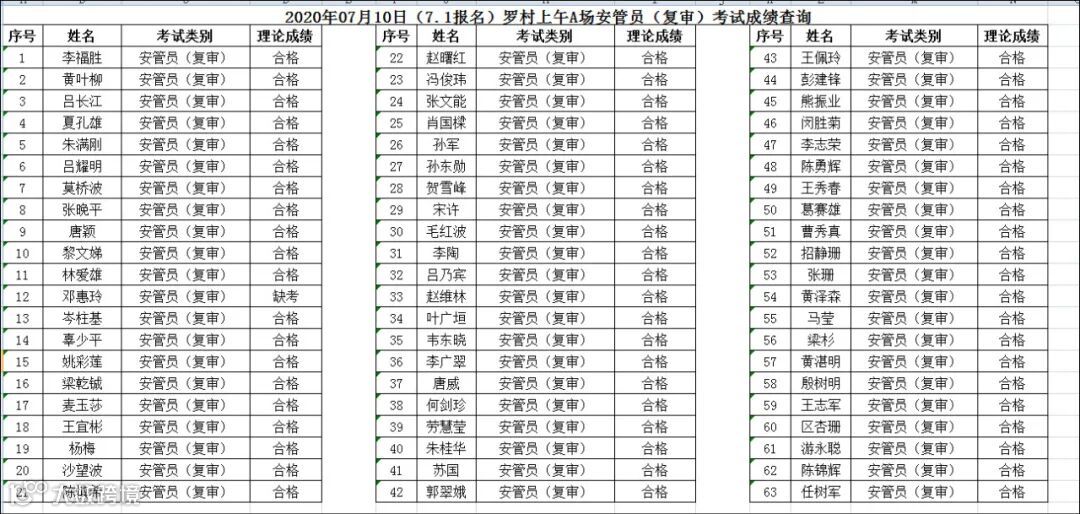 2020.07.10(7.1报名)罗村上午A场安管员(复审)考试成绩查询