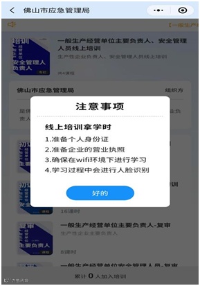 点击其中任意一个入口进入后,会弹出【注意事项】页面,点击【好的】进入【一般生产经营单位主要负责人、安全管理人员线上培训】页面: